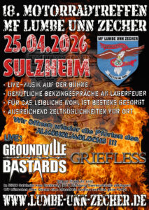 Am 25. April 2026 spielen wir zusammen mit den GROUNDVILLE BASTARDS auf dem 18. Motorradtreffen der MF Lumbe unn Zecher in Sulzheim! Weitere Details unter der Rubrik „Dates“. Seid dabei!
